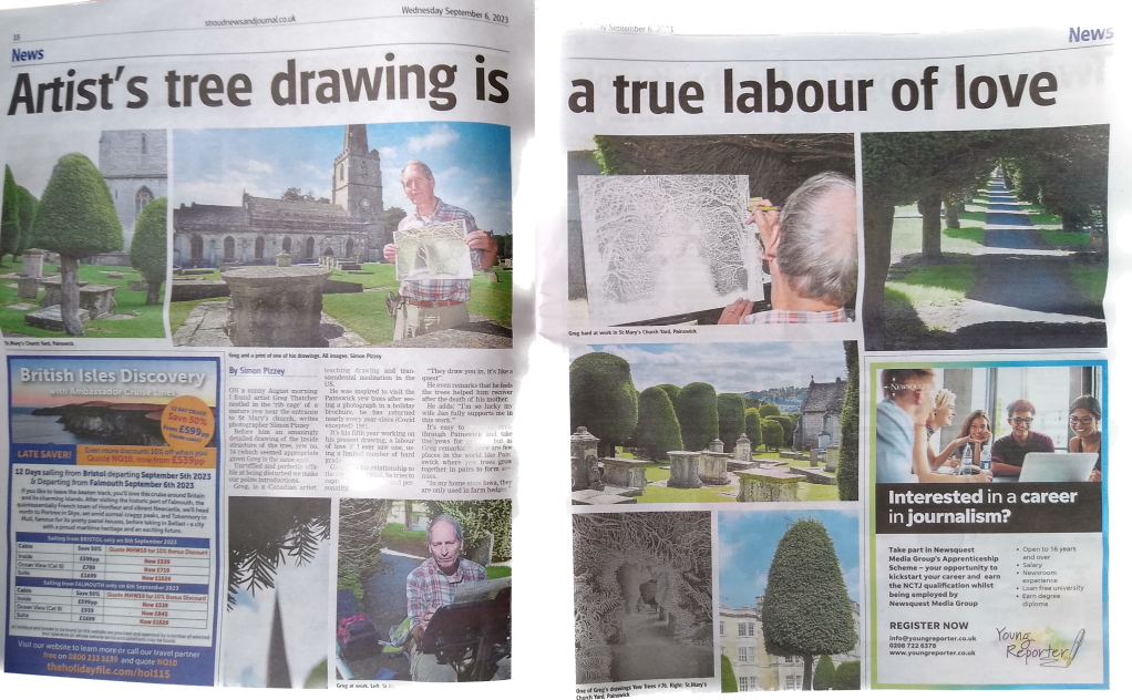 August 20, 2023: Artist’s labour of love records Painswick’s yew trees by Simon Pizzey for Stroud News. See a layout of the article.
