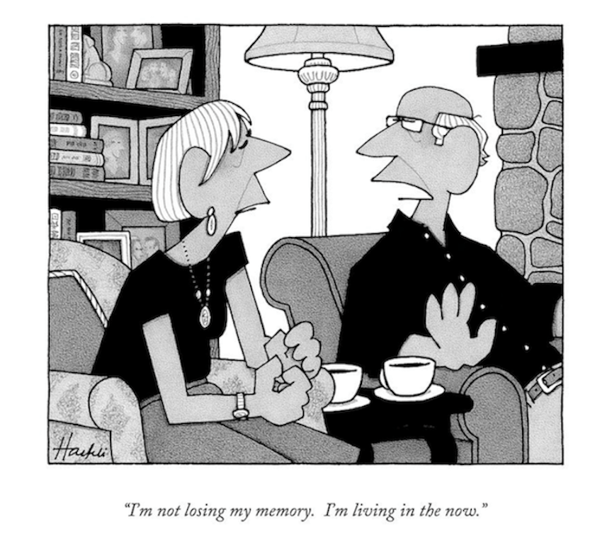 William’s cartoon shows a wife’s frustration with her husband’s memory loss, and his clever way of dealing with it: “I’m not losing my memory. I’m living in the now.”