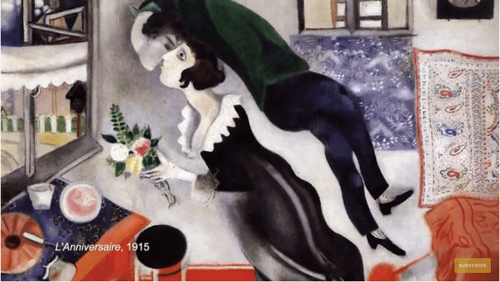 This blog post contains the Canadian documentary film, Marc Chagall: The Colours of Love, and 2 short videos. They cover his life and work, and the love of his life, his muse and wife, Bella. Marc Chagall’s paintings contain beautiful colors of love and a joyful floating lightness of being.