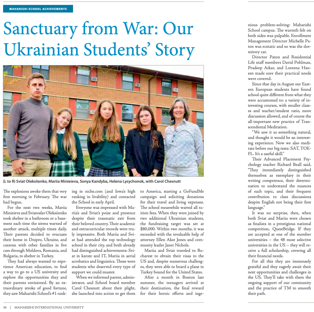 To more easily read this article, click on and enlarge, Sanctuary for War: Our Ukrainian Students’ Story, published in the MIU Annual Report 2022 on pages 56-57. For more of the earlier backgrounder to this story, read: What happened when three Ukrainian students reached out to Maharishi School in Fairfield, Iowa.