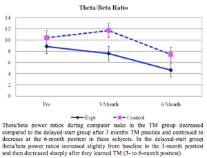 During the first 3 months of the study, the theta/beta ratios of the control group (delayed start) actually increased. After learning, and practicing TM for 3 months, this group experienced dramatic decreases in theta/beta ratios and increased verbal fluency as well.