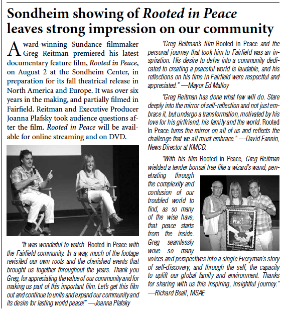 The Fairfield Weekly Reader posted 3 articles on the screening of Greg Reitman’s Rooted in Peace