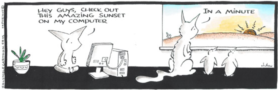 Rick Hotton, creator of the award-winning cartoon Holy Molé, opens our hearts and minds with insightful humor. Speaking of interfacing with reality through computers instead of our own eyes, this cartoon make us laugh realizing there’s more to life when we’re truly present.