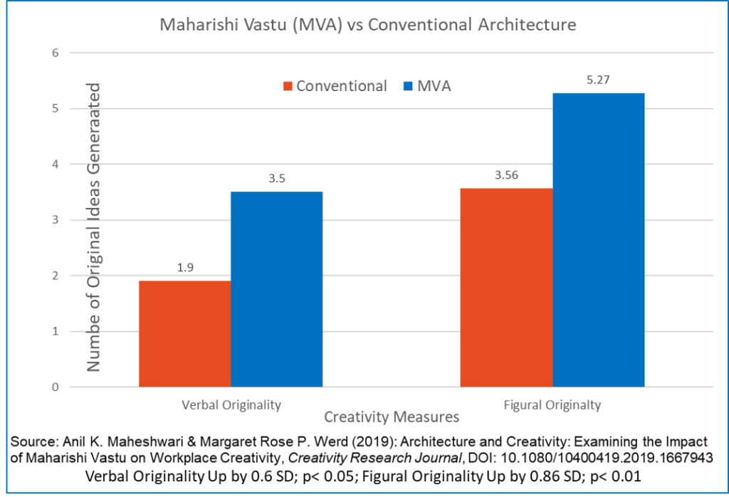 “This research experimentally demonstrated that moving from a conventional architecture building into a Vastu building led to large measurable improvements in employee creativity, in particular in the originality of the ideas generated and their open-ended and detailed elaboration,” said Professor Anil Maheshwari of Maharishi University of Management, the first author of this study. “I think every organization, big and small, could benefit from this.”