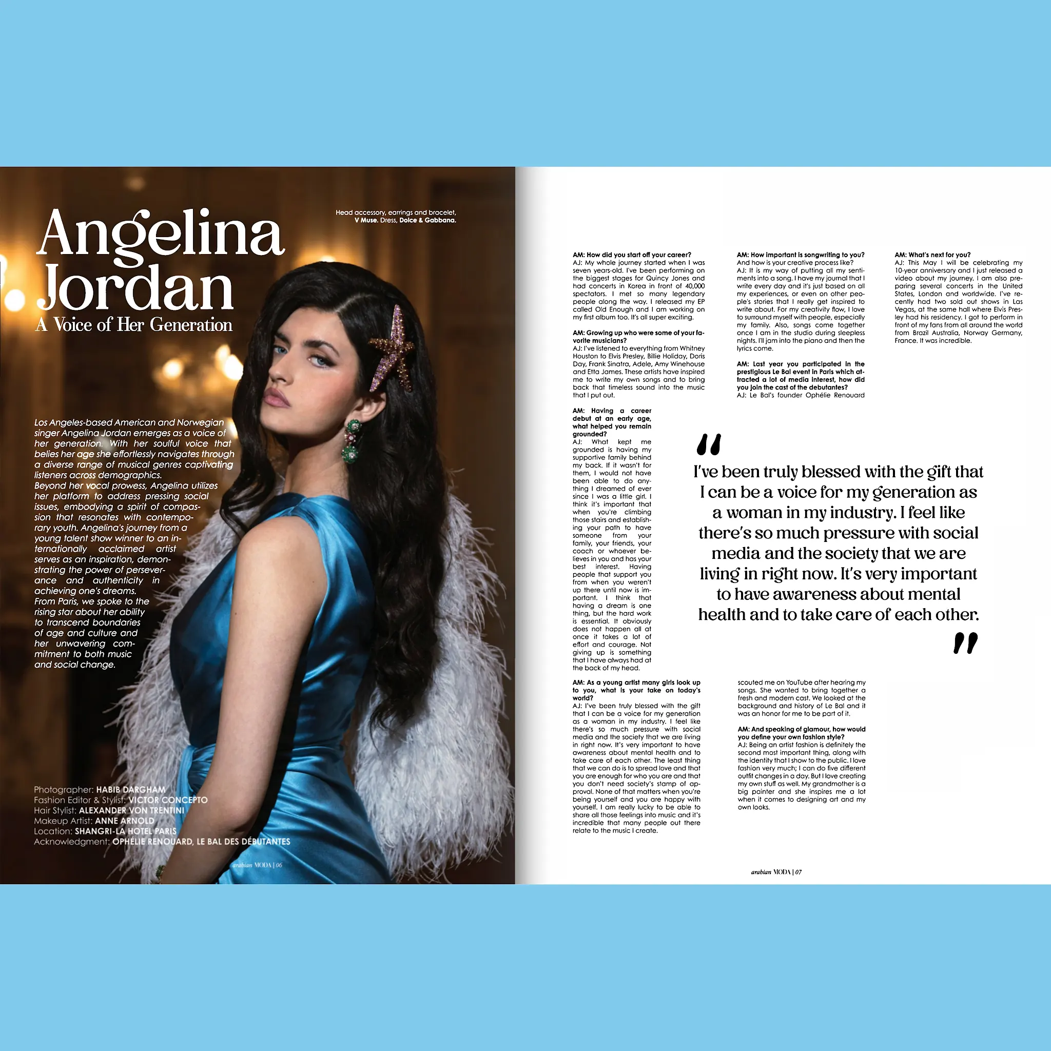 April 22, 2024: Arabian Moda Magazine‘s Special Paper Edition — The Festival Issue features Angelina Jordan. The Los Angeles-based American and Norwegian singer emerges as a voice of her generation. Click title or photo to read the cover article: Angelina Jordan and the Route to Stardom, which includes a 30-second video. I added the intro to this interview because it’s the best piece of writing I’ve seen describing Angelina. Her mature answers are clear and informative. She knows where she’s going in her own way at her own pace.