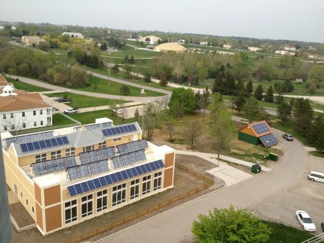 A view of Maharishi University of Management‘s new Sustainable Living Center taken from the 100-foot wind turbine tower by MUM alum and installer Troy Van Beek of Ideal Energy. Energy cottage is to the right, Golden Domes are in the distance. (Photo by Troy Van Beek)