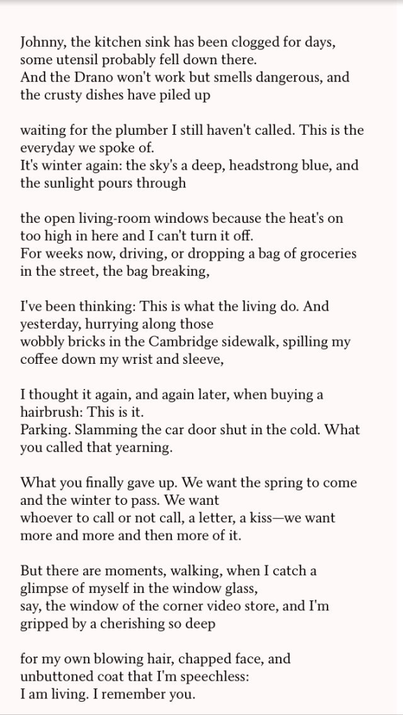 It’s been a little over a year since I posted this, and after rereading Marie Howe’s poem to her brother, the last two short declarative sentences in the last line still surprise and move me: I am living. I remember you.